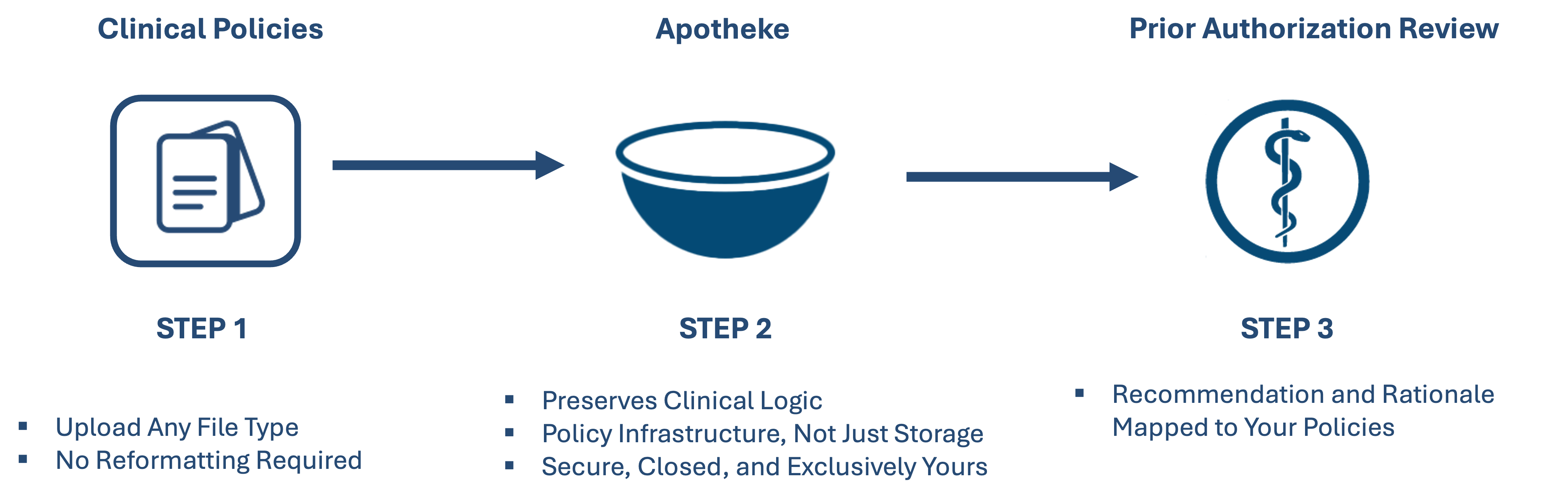 Apotheke represents a shift away from static workflows and toward adaptive, explainable, and scalable clinical decision support designed to help organizations deliver faster, more consistent, and more defensible prior authorization outcomes.